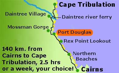 Port Douglas lies 66 km. or a bit over an hour north of Cairns, from here it is about 75 km. or nearly two hours further to Cape Tribulation, narrow winding scenic roads and the cable ferry over the Daintree river add a bit of time to the journey.