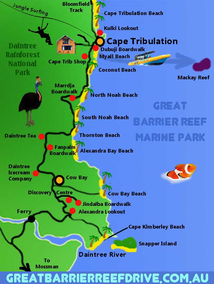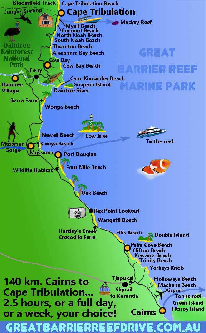It’s not that hard to find your way to Cape Tribulation, it’s basically straight ahead after leaving Cairns with one right hand turn 25 km. after Mossman, but the map will show you where all the many attractions along the way are so you don’t miss them.